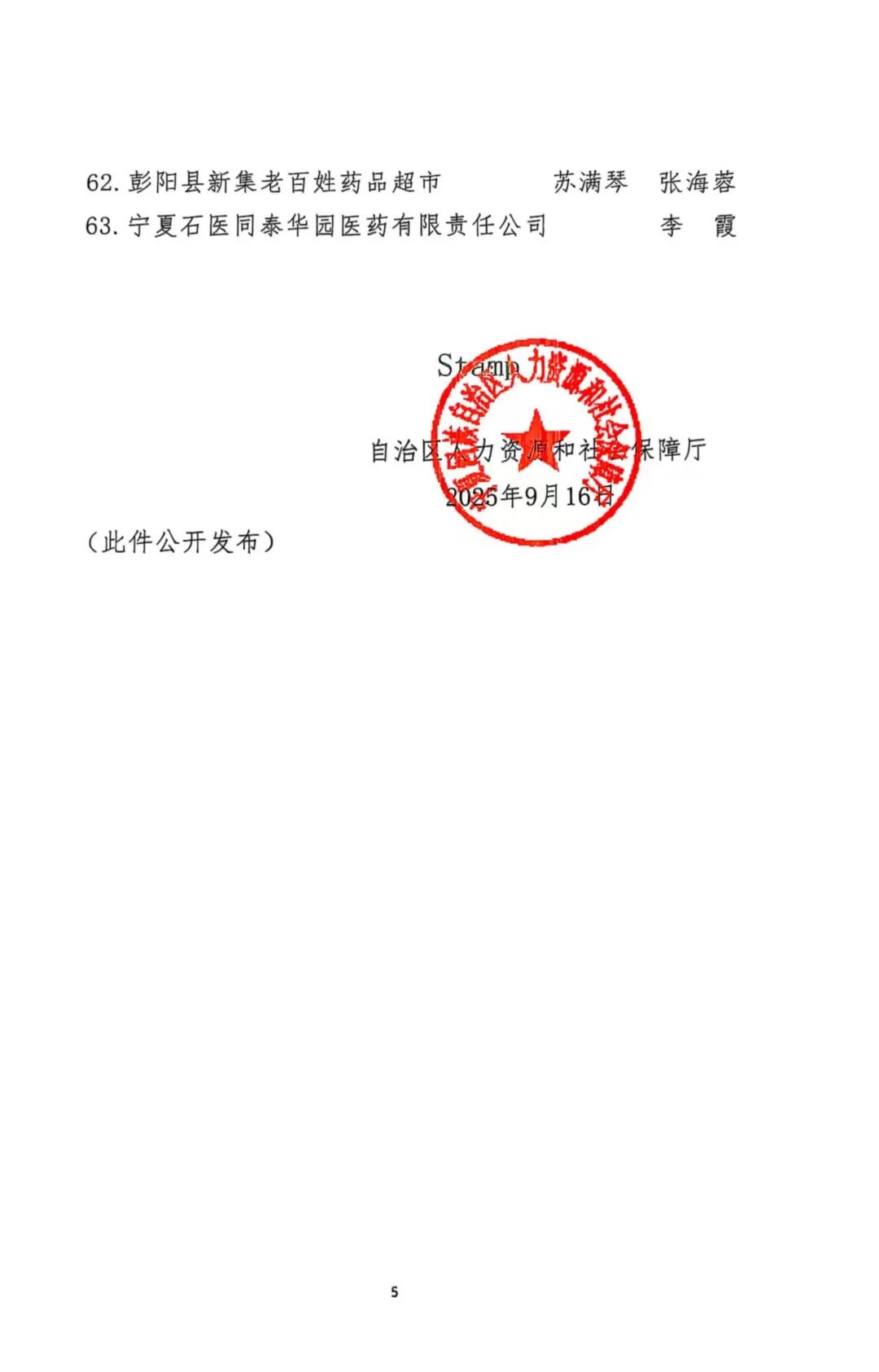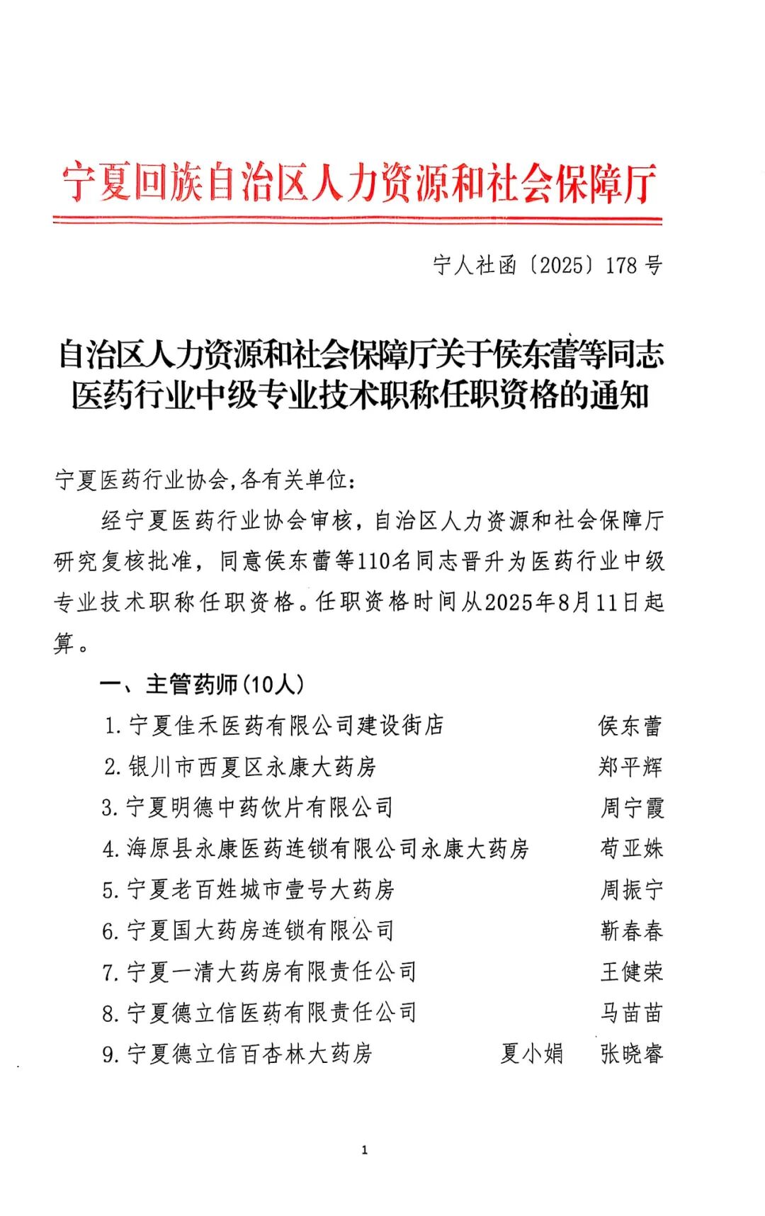 2025:自治区人力资源和社会保障厅关于侯东蕾等同志医药行业中级专业技术职称任职资格的通知