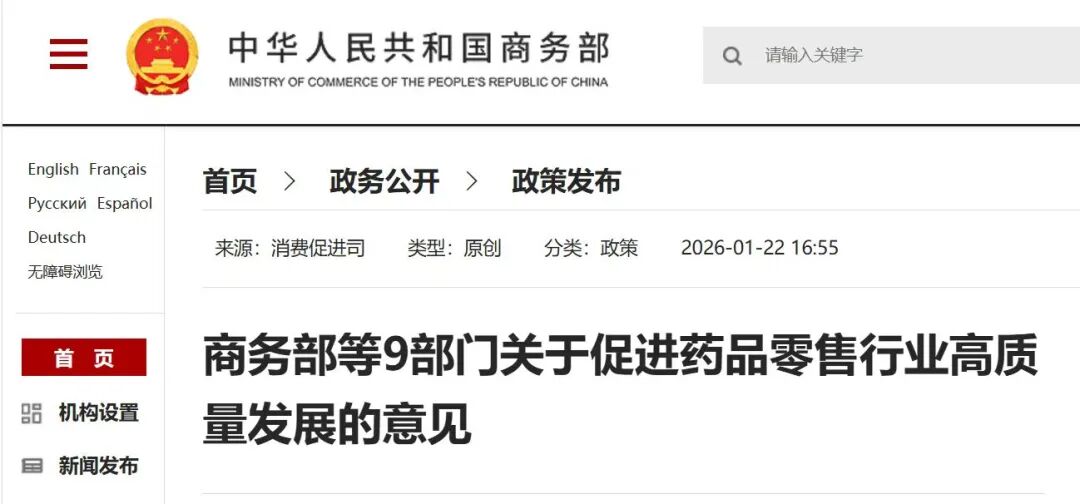 1月22日,商务部、国家发展改革委等九部门联合发布《关于促进药品零售行业高质量发展的意见》,围绕完善药事服务、强化应急保供等五方面,提出18项具体举措。全文如下。